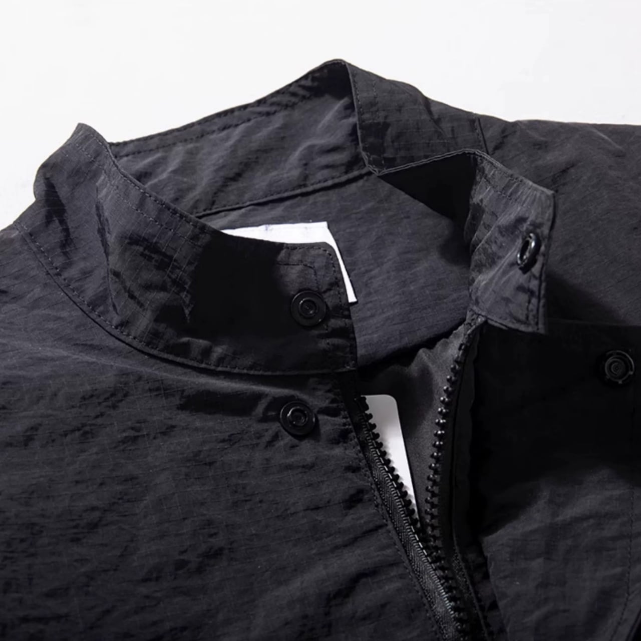 スタイリッシュなスタンドカラーとドロップショルダーが特徴のジャケット。