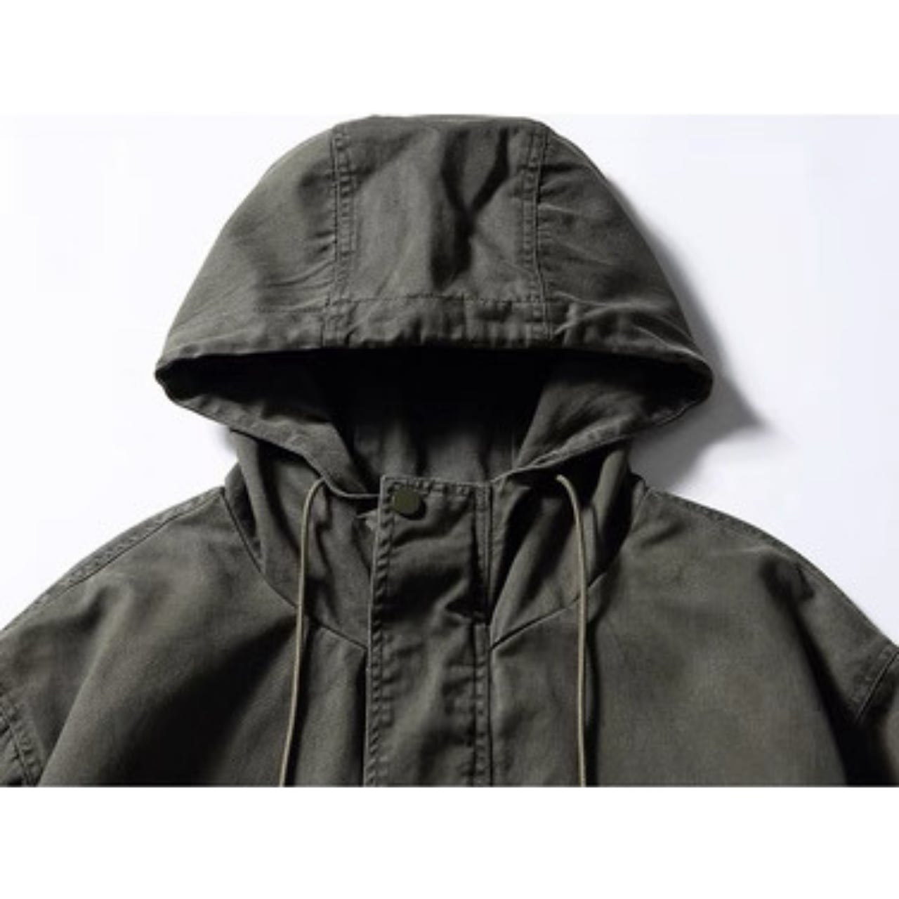 ボタンフロントのヒップ丈フード付きジャケット。